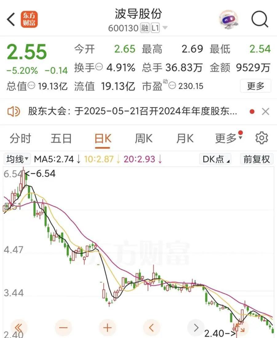 据统计,今年以来,波导股份股价已跌45.97%。截至4月28日收盘,波导股份股价收于2.55元/股,当日跌幅达5.2%,总市值缩水至19.13亿元。